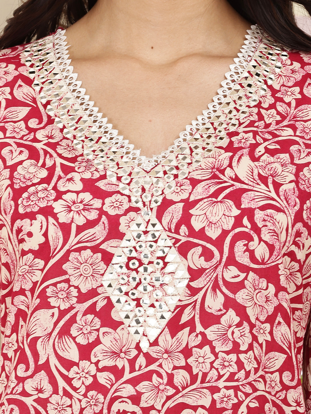 Kurta: A straight-cut red kurta adorned with intricate white floral prints, featuring a stylish V-neckline with delicate lace detailing. The soft cotton fabric and 3/4th sleeves make it perfect for all-day wear.
