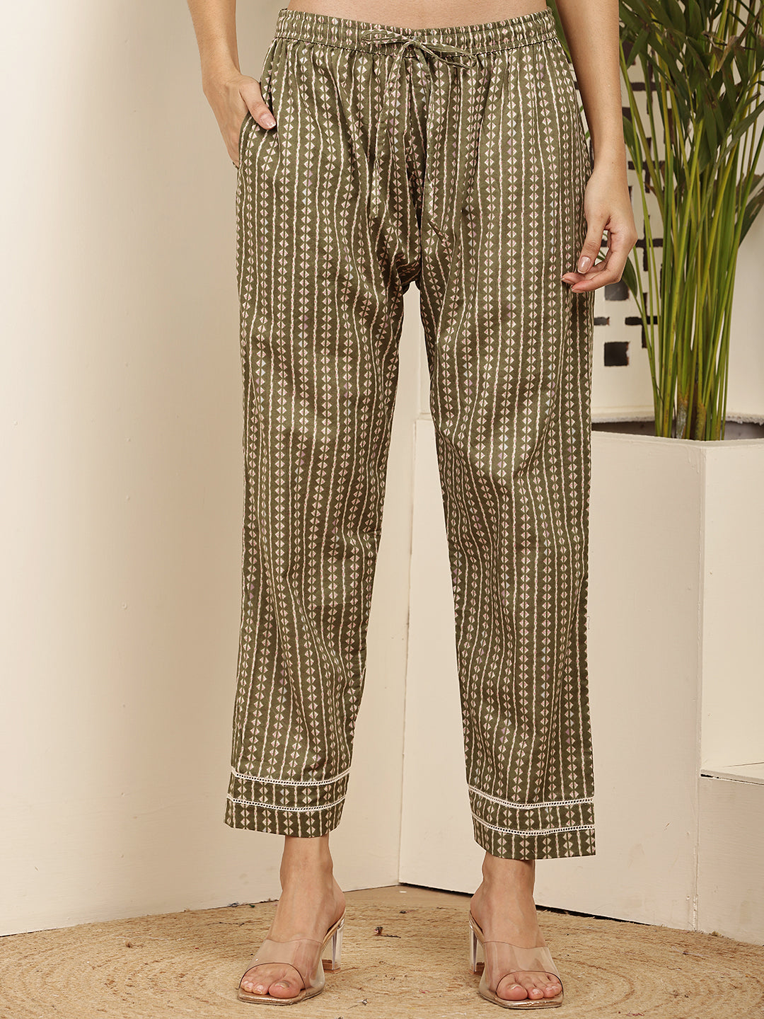 Add a refreshing touch of elegance to your ethnic wardrobe with this beautifully crafted three-piece cotton suit set. The olive-green kurta features vibrant pink and lavender floral prints, enhanced with a detailed printed yoke and three-quarter sleeves for a graceful silhouette. Paired with matching straight-fit printed pants and a soft printed dupatta in complementing olive and pink hues, this ensemble blends tradition with modern charm. Made from breathable cotton fabric, it offers all-day comfort and effortless style—perfect for festive gatherings, casual outings, or office wear.