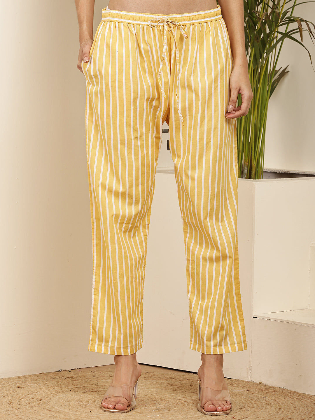 Bring sunshine to your wardrobe with this vibrant yellow cotton kurta set, designed to keep you stylish and comfortable all day long. The straight-fit kurta features beautiful white floral prints, a round neckline with delicate detailing, and three-quarter sleeves for a graceful touch. Paired with striped straight-fit pants and a matching printed dupatta with floral motifs and tassel accents, this three-piece set perfectly balances elegance and comfort. Made from breathable cotton, it’s an ideal choice for summer wear, festive gatherings, office looks, and casual outings.